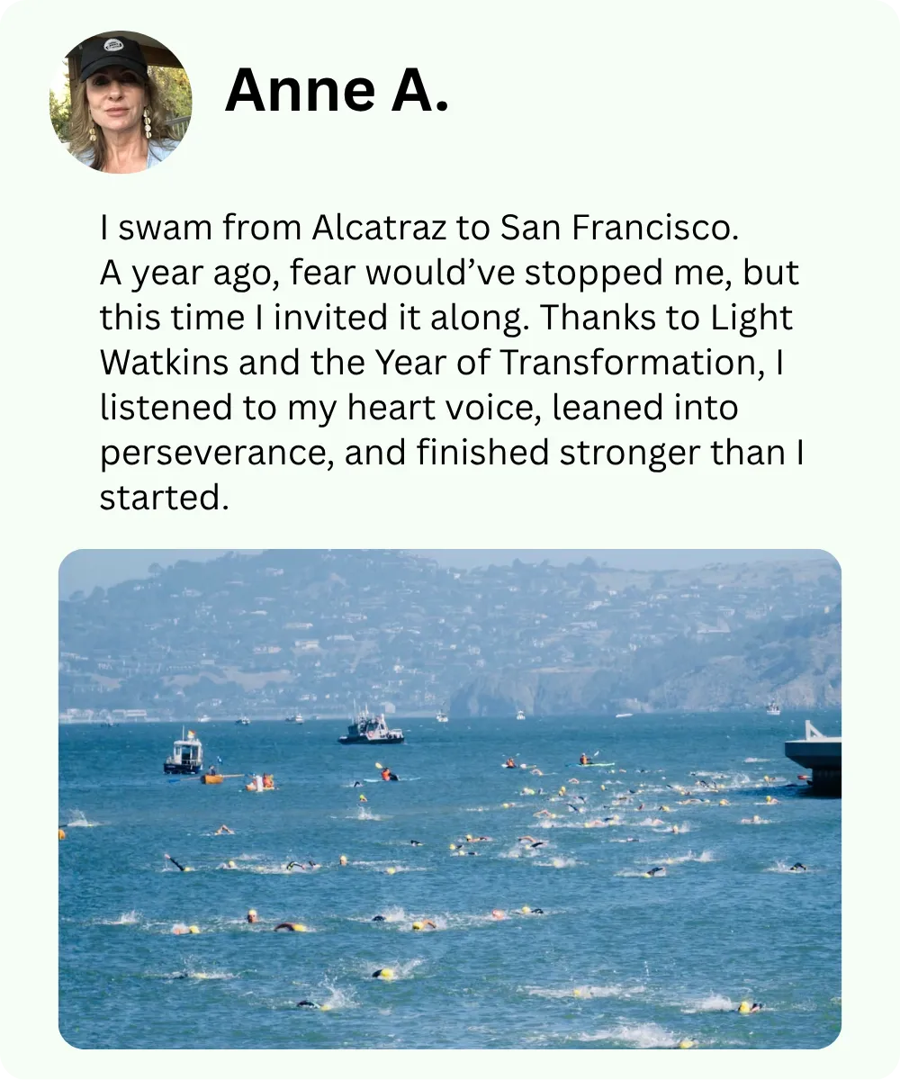 Swam from Alcatraz to San Francisco, overcoming fear and building deep trust in her inner voice.